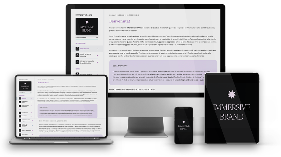 Immersive Brand è un corso online di sei mesi, fruibile quando vuoi, da dove vuoi, seguendo i tuoi ritmi. È pensato per imprenditrici e libere professioniste che vogliono andare oltre la superficie e costruire un brand con fondamenta solide.