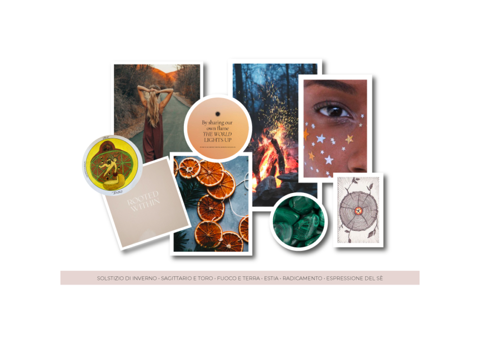 Tutti questi elementi si sono magicamente fusi quando ho notato la connessione tra la carta dei tarocchi e la data di nascita di Giorgia (solstizio d’inverno): guardando la carta dal mazzo Wild Unknown, ho notato un pentacolo al suo interno che mi ha subito ricordato una mela tagliata a metà, che ho ricollegato alle decorazioni solstiziali. Da lì, la mia mente ha viaggiato verso un’altra decorazione solstiziale: l’arancia (di cui ho sentito il profumo tutto il tempo) che ha portato con sé significati di: