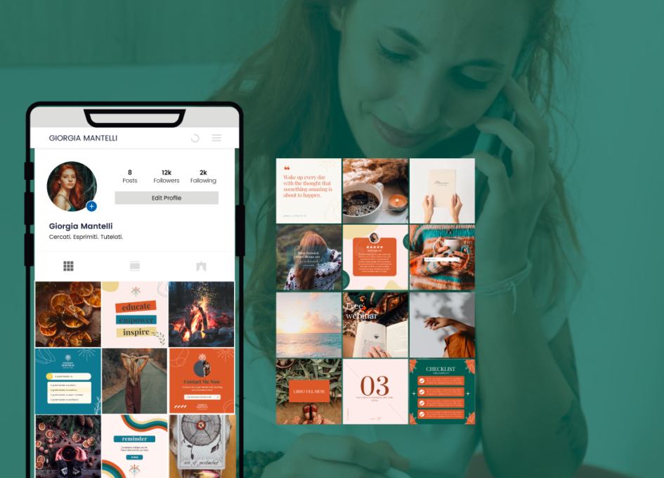 È emersa quindi la scelta naturale del colore arancione bruciato, colore di nascita del business di Giorgia e perfettamente allineato con la sua energia solare, il suo ruolo di guida e mentore, la trasformazione che porta nelle vite delle sue clienti.