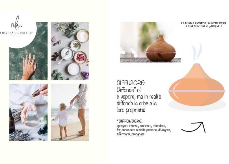 Un oggetto semplice ma potentissimo dal punto di vista simbolico: “il diffusore diffonde oli e vapore, ma in realtà diffonde le proprietà aromaterapeutiche delle piante contenute negli oli!” Inoltre, il concetto di “diffondere” è proprio quello di emanare, spargere intorno, effondere, far conoscere a molte persone, affermarsi, propagarsi. Esattamente ciò che Silvia fa con la sua community.