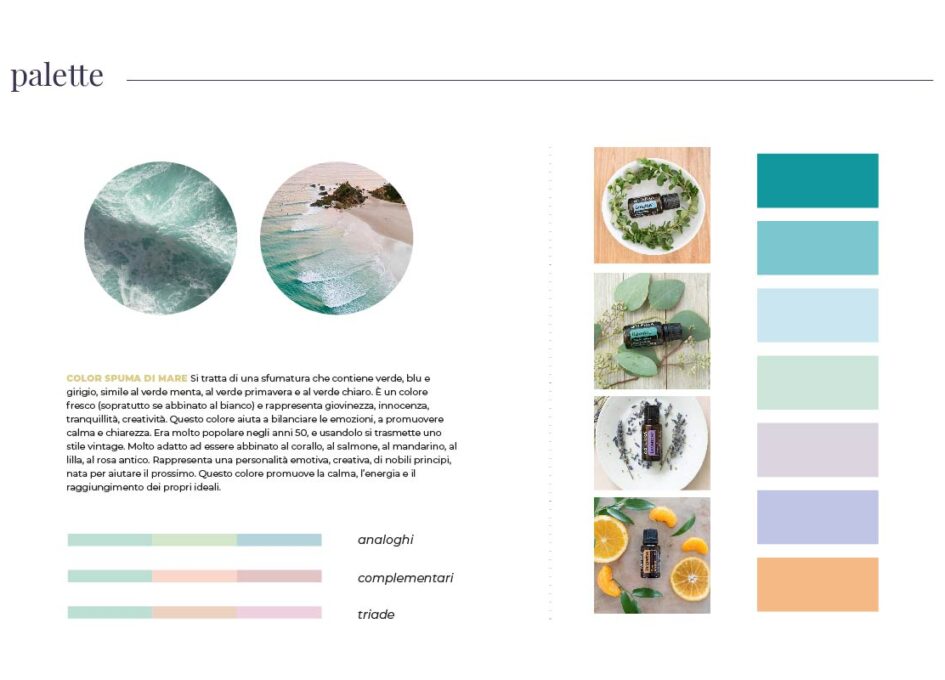 • toni pastello ispirati a rosmarino, menta, lavanda e mandarino, richiamo diretto agli oli essenziali più noti,