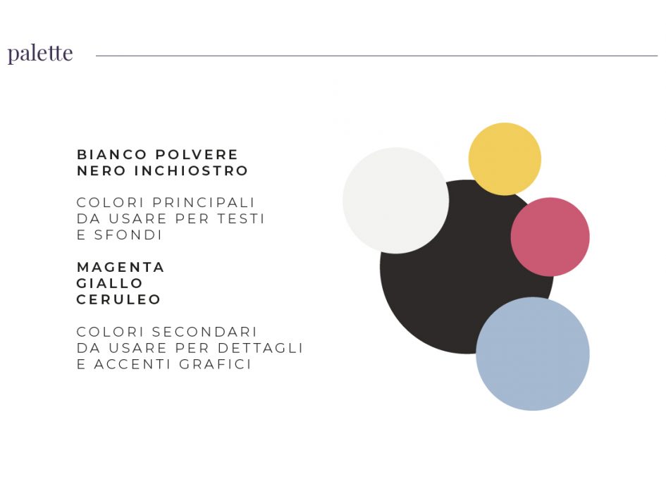 La base cromatica parte dal binomio bianco/nero della carta stampata, arricchito da colori identitari e vibranti: